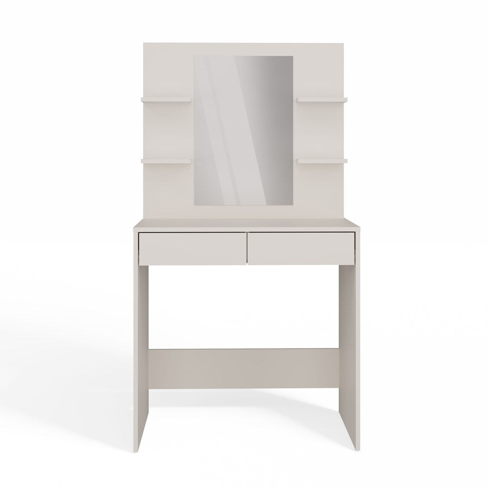 Elegant sminkebord med spejl og 4 hylder Serie: MARINA Model: Skrivebord 2S + MARINA spejl 4P Farve: Kashmir En eksklusiv og stilfuld beige nuance, der tilfører rummet varme og elegance. MARINA 2S med spejl og 4 hylder er den perfekte kombination af æstet